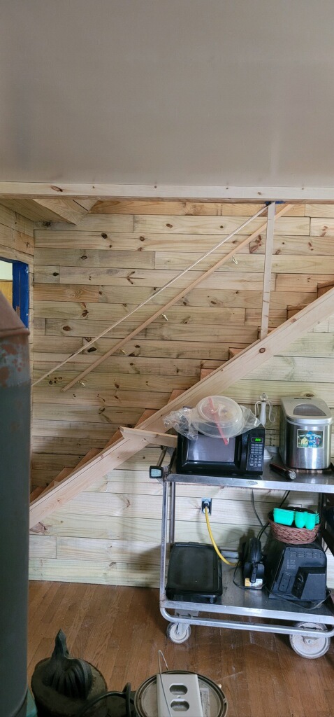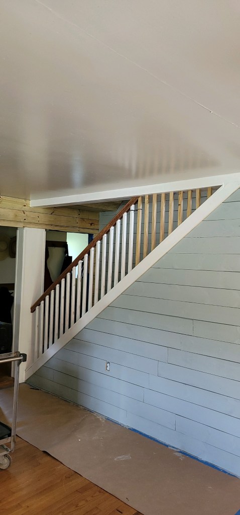 Dad worked on the angle of the handrails and then figured out how to do the spindles(🤷🏻♀️not sure if that is the right word) they will be white as well. Thank you mom for volunteering to paint them!