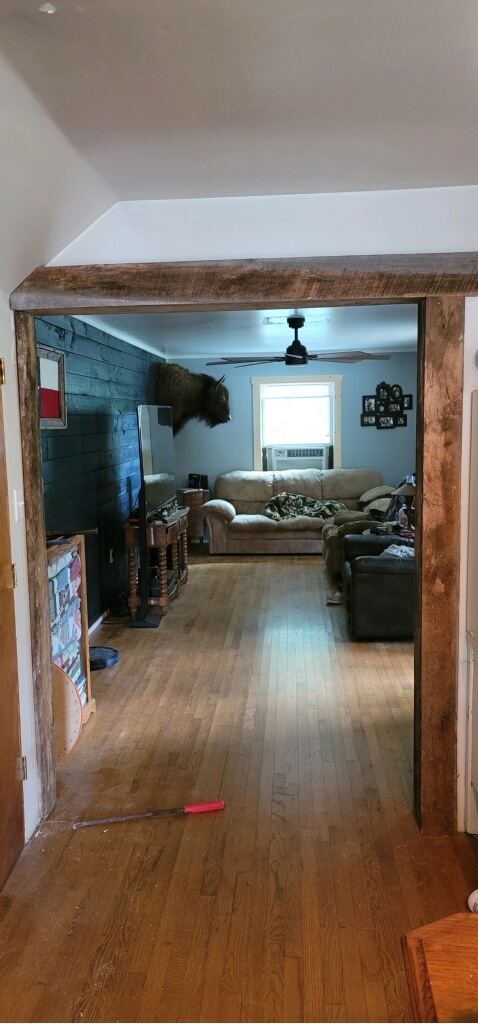 My dad has been avoiding the staircase like it’s gonna give him cooties (honestly I don’t blame him) so, he worked on the door way going into the living room from the dining room. Chad really wanted it to have an old rustic beam there. Dad was able to work out a deal with the neighbor for a few rough cut boards. The boards had been out in the elements for a while and made it hard to work with because they were a bit warped. Dad worked his magic and made it look amazing! Just got a little more trim pieces and some mini blinds and the living room is complete!!! So exciting!! Dad also put in a light fixture in the stairway down to the basement. It was a very dark stairway and definitely needed illuminated.