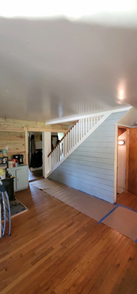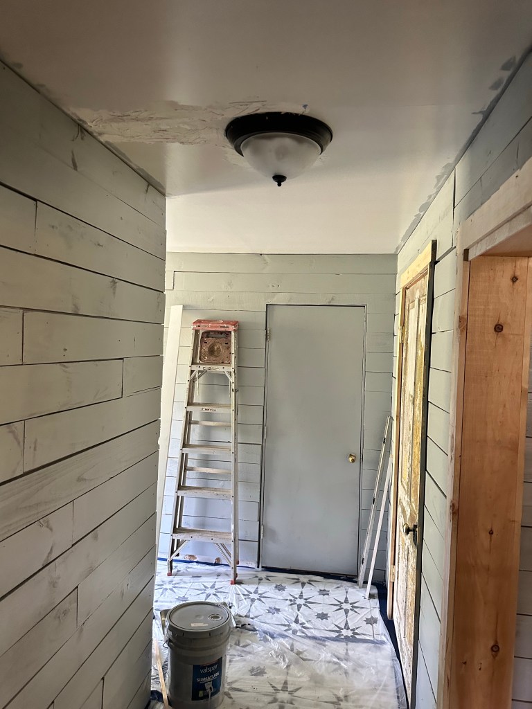 Chad fixed all the drywall in the pantry, put up some thin plywood on the bottom of the walls and then him and Hunter started ship lapping the ceiling and walls in there.