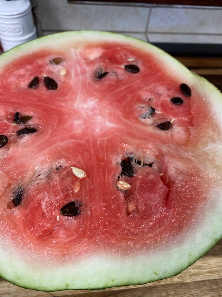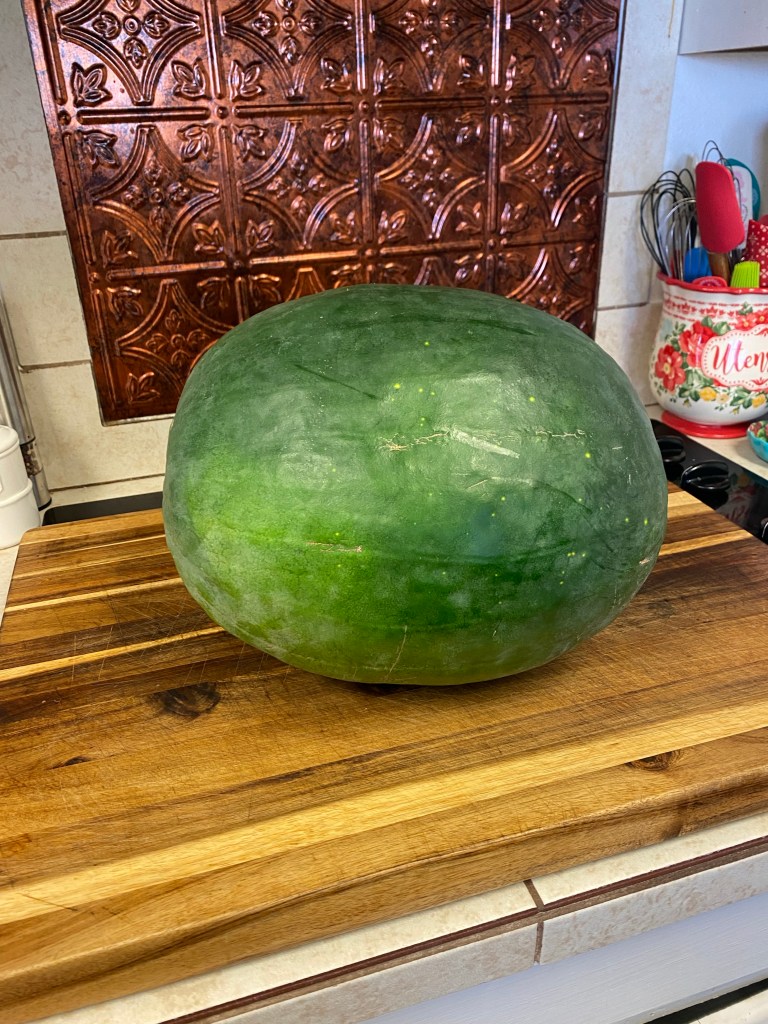 With the growing season coming to an end we picked one of our watermelons on the vine. It weighed 25.6 lbs! It was amazing to watch it grow from a seed. Isn’t she a beauty?