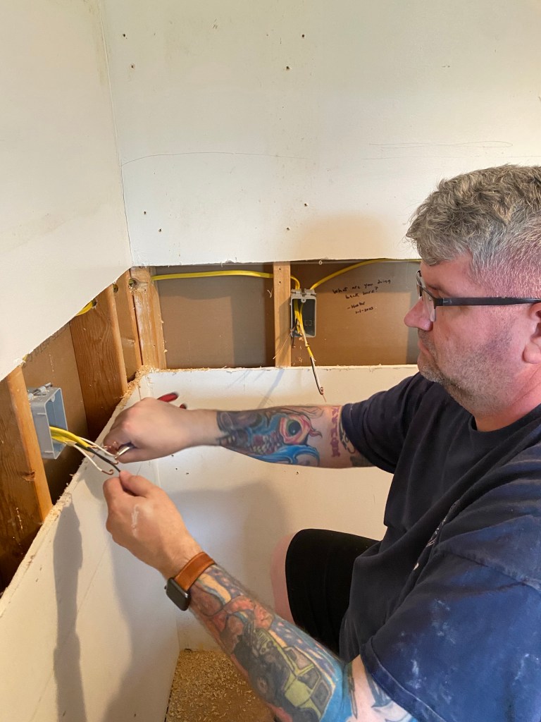Then we got started on running the wires in the Butler’s panty. Maneuvering the wire around the corners is a nightmare and I am pretty sure I am the slowest electrician and no one would hire me but I am still proud that I could do it. Thankfully Chad and my dad were there to help!