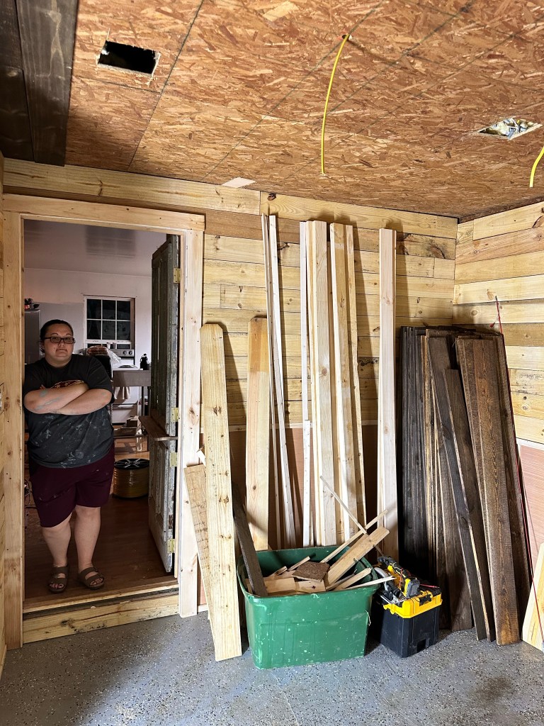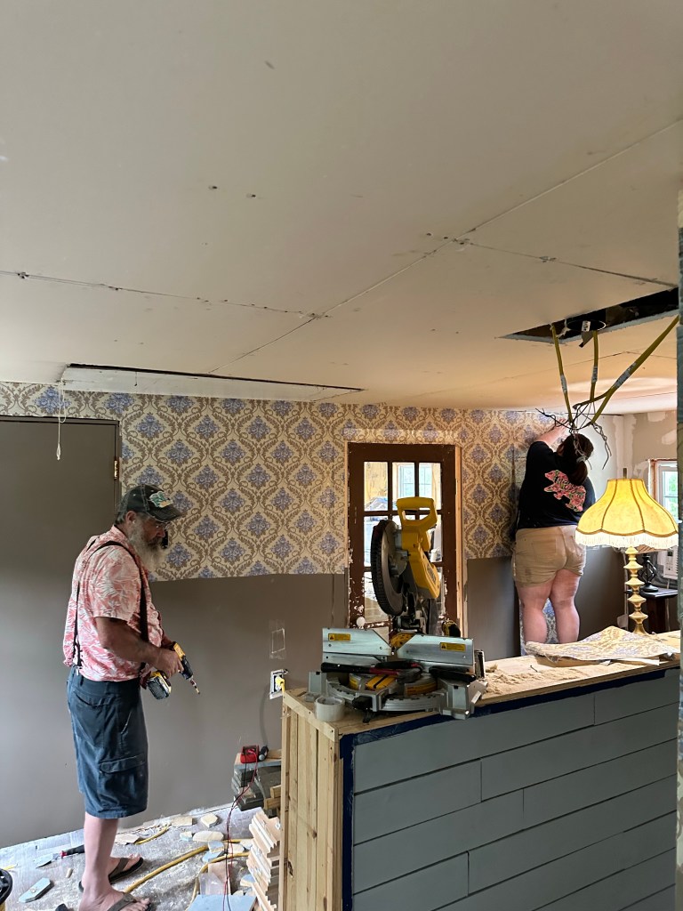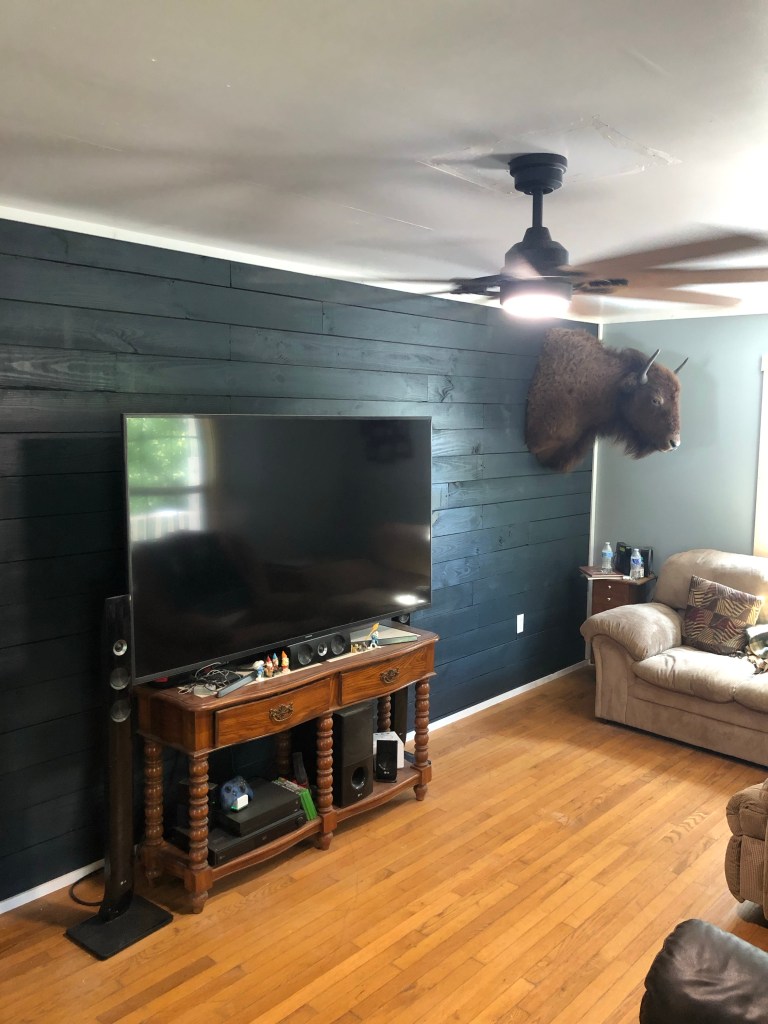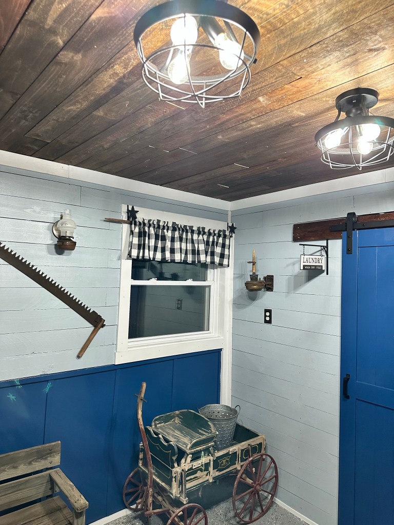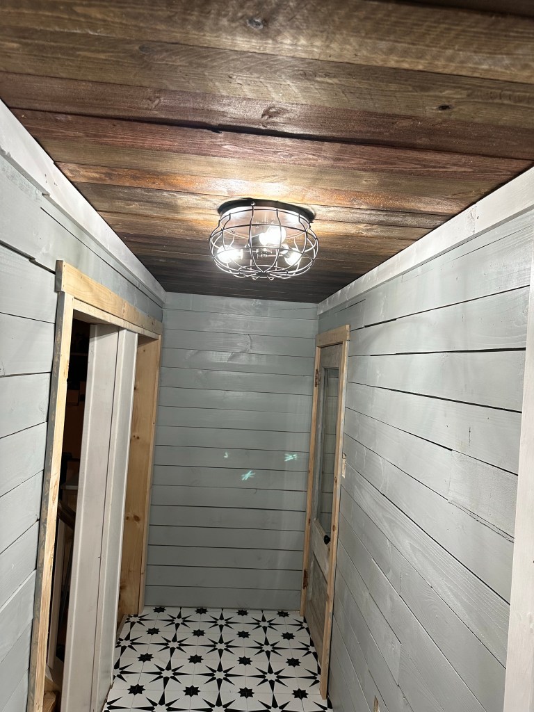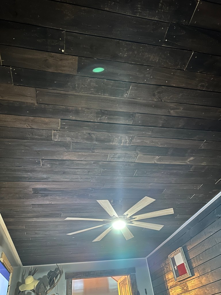 Chad was able to shiplap the ceiling after Cheyenne stained all the boards and he hung the new lights up. It looks absolutely amazing! Cheyenne said she is now a construction worker! ❤️