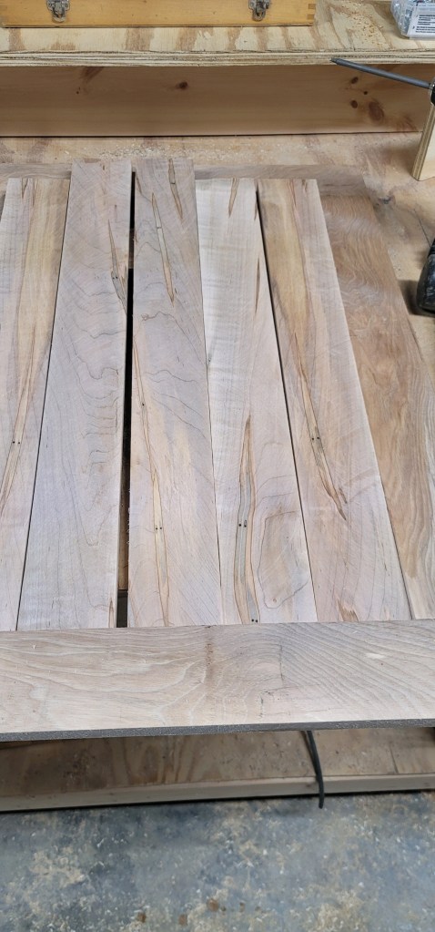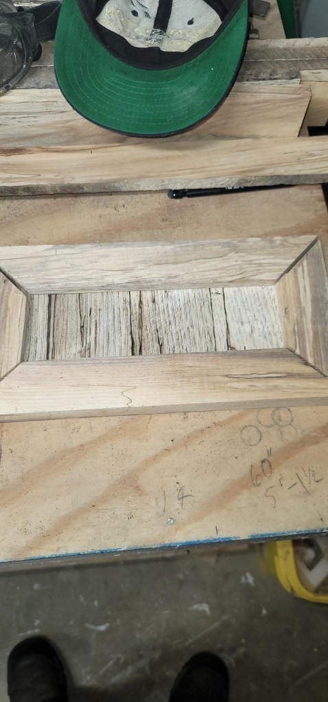 I have given my Dad my vision of what I NEED…. (not want) in my kitchen. So he has begun to custom make the kitchen cabinets. Now mind you, this is all being done with him having an injured arm having to take my Mom and him to PT, Hunter to work, along with everyday Farm chores. So it will not be an over night project. When it comes to the cabinets we could have just went and bought cabinets at Lowes, Home Depot or some where, but where is the true vintage “farm house look” and design for that? If y’all recall in earlier post about a year ago Chad bought a Pallet of rough cut hardwood boards from the Amish lumber yard down the road.