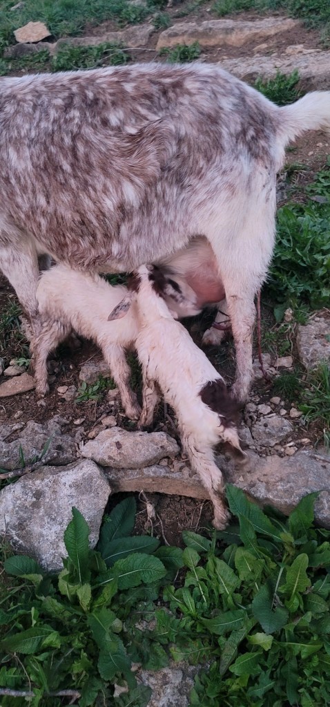 So I am sure, y’all will be excited to know our critters have expanded the herd. On April 2, 2023 Ginger gave birth to the 2 most adorable little kids you could imagine. We got a new boy we named One Eye Jack (due to a black patch over one of his eyes) and girl we named Diane. So dad knew that she was fixn’ give birth, so he made her a nice comfy place in the barn with hay and such. But, Ginger decided to go on an adventure up the to the rocky patch on the hill to give birth. 🤣 We now have a grand total of 10 goats 🙂