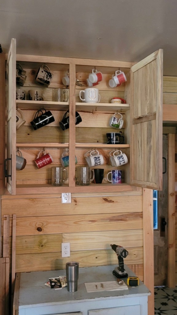Chad finished the living room. All that was left from previous trips few years ago was shiplapping the ceiling. His poor neck hurt so bad on this trip, after looking up so much doing ceilings.