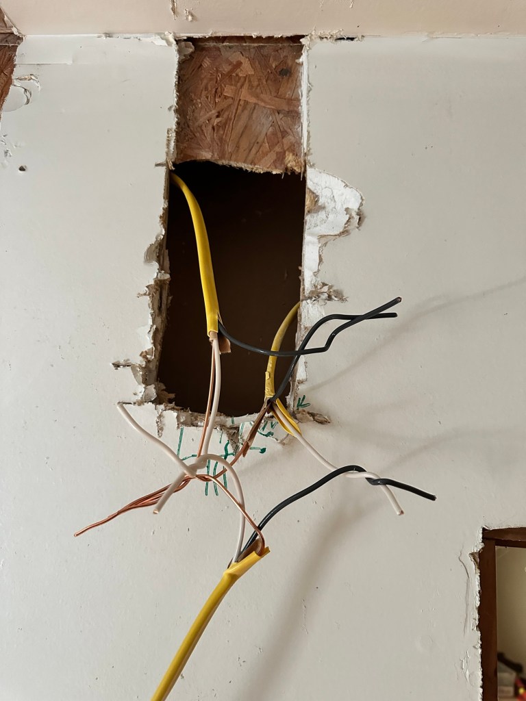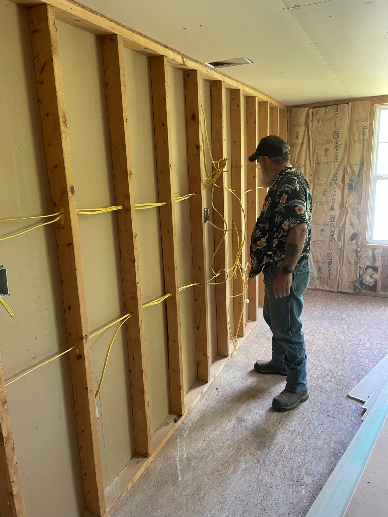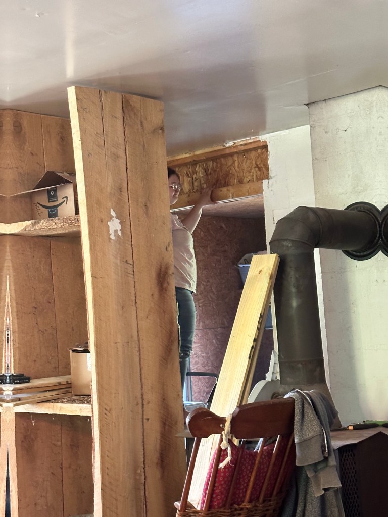Unfortunately, they had to cut several studs in the wall and reframe it. There also ended up being an electrical outlet in the way, from the other side of the wall. Chad said “only you would find a spot in an Amish, built farmhouse that would require an electrical outlet that we put in there only a few months ago, to be moved” 🤣🤣 oops 😬
