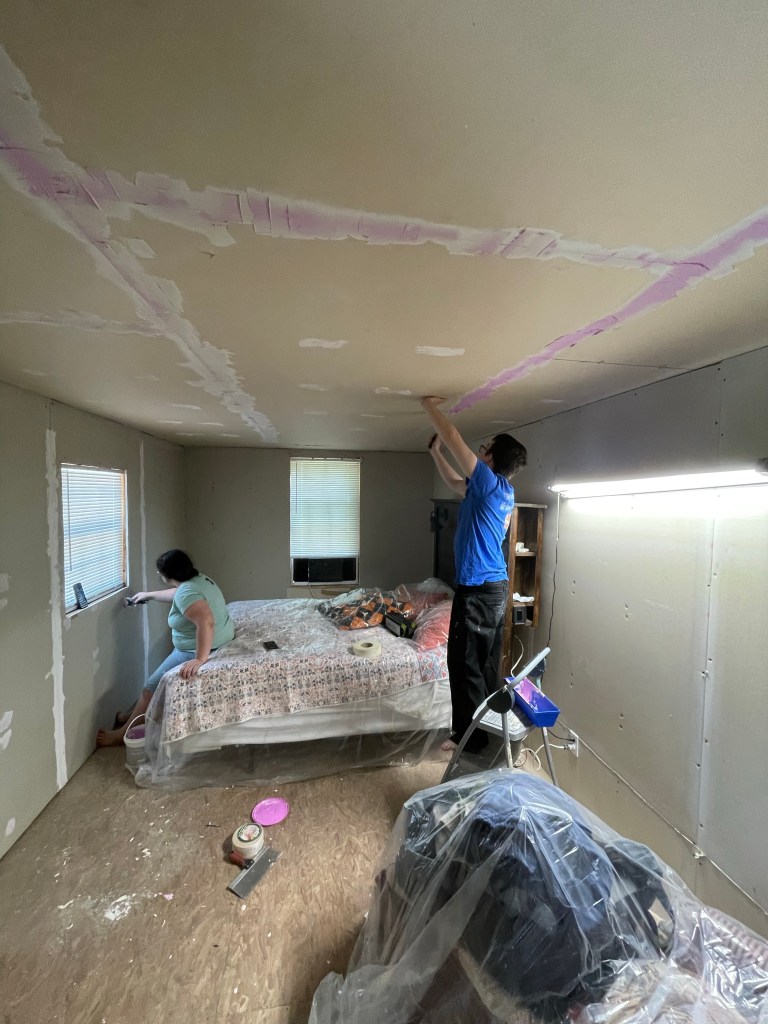 We have a few ideas for Cheyenne’s room. This trip, we only had time to shiplap her ceiling and install the ceiling fan she picked out. She was super excited about that.