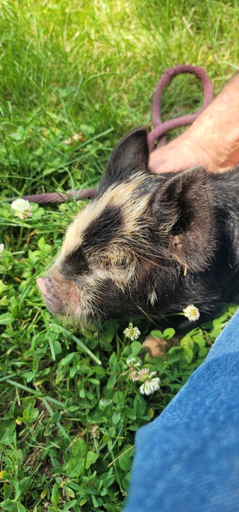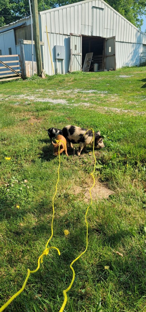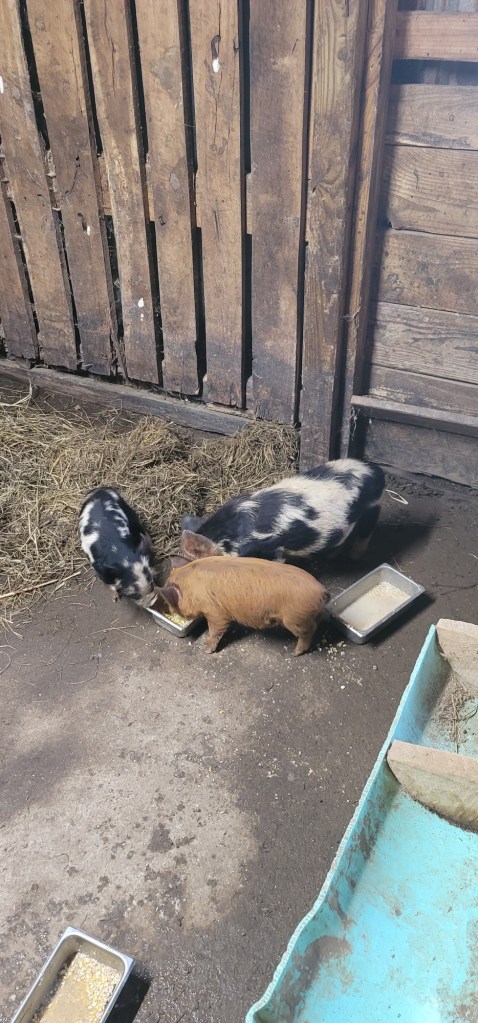Dad decided it was a great time to get some “bacon bits” on the farm, so the PSF Herd has added three Kune Kune piggies 🙂 The Big Boy is Kevin (as in Kevin Bacon lol) and the girls are Lily and Rose. Dad says he intends on eventually butchering them out, but it’ll be cute to watch them in the mean time.