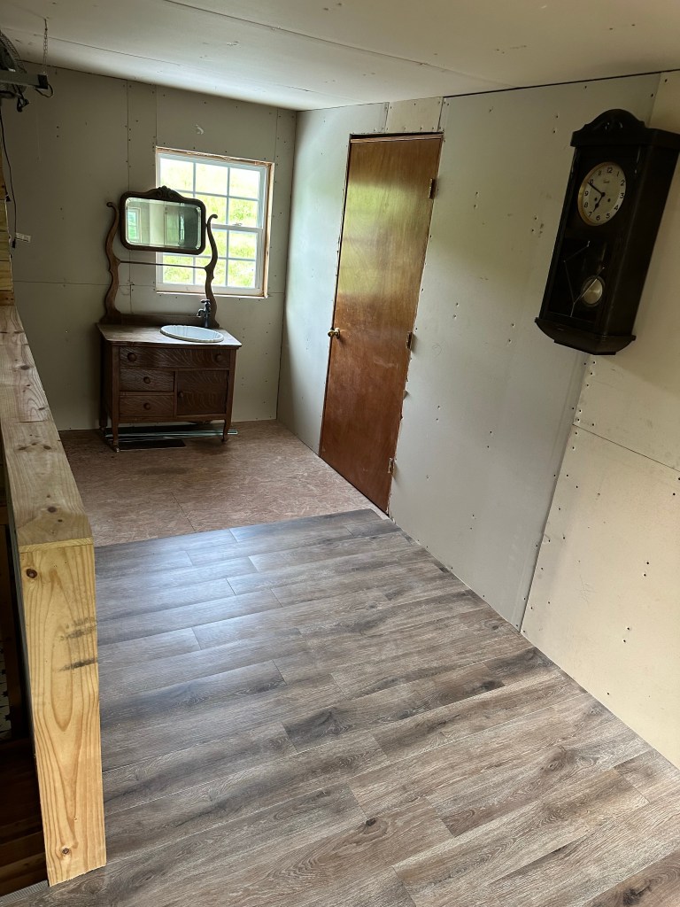 Got the wallpaper up and the bead board installed and painted. Chad was able to shiplap the ceiling and get the ceiling fan installed. We didn’t like the small closet which was built in when we bought the farm so we tore it out. We have a few ideas for the closet space to install in the future. A built in wardrobe.