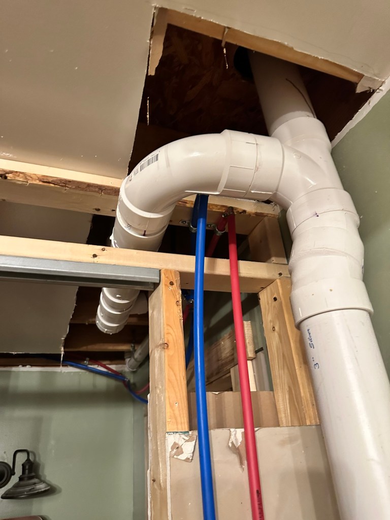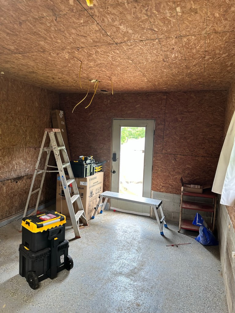 He wanted a bathroom down there and apparently that’s easier said than done. Underground bathrooms requires a few special plumbing gizmos. We discovered it needs a macerating toilet. (Basically it’s like a garage disposal for a toilet, I think 🤷♀️).