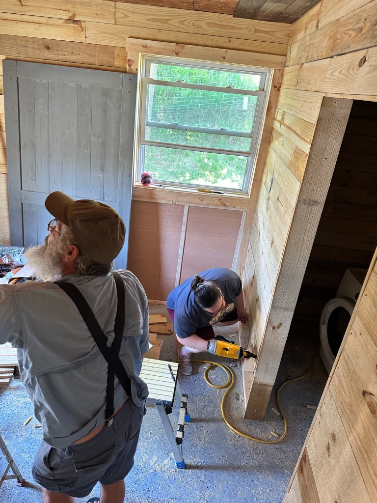 It was getting late and my parents were ready for bed so we cleaned up their room and I went to join Chad and Hunter with the shiplap. Hunter trailed off to bed soon after and Chad and I finished the shiplap.