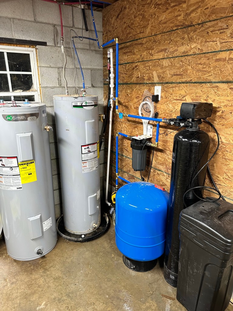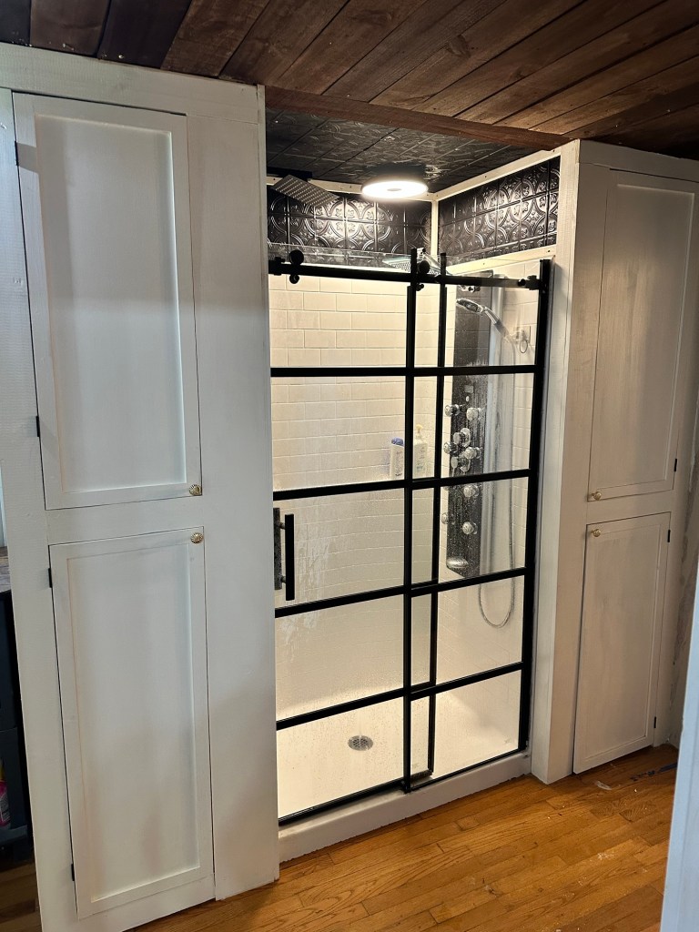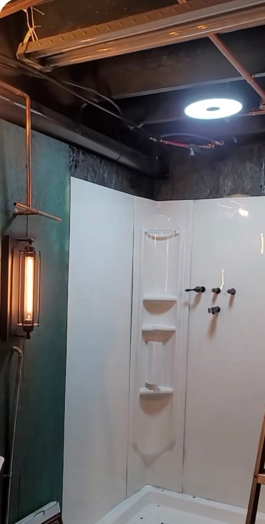 In the master bath’s shower he added a high tech shower apparatus. It has a digital display to see the temperature. Additionally, it has different settings and multiple shower massage jets! Which is great after a long day working on the farm. He also installed a “fancy schmancy” waterproof LED light that has a bunch of different colors and brightness. This is great for days I have a migraine. The light also has a Bluetooth speaker built in so we can listen to music 🎶. We were so impressed with the light we ordered two more for the other showers ( one in the basement and one upstairs).