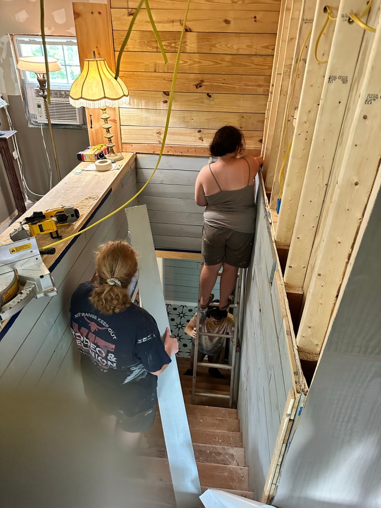 The shelves you see us taking apart had some old funky shelf liner on them but come to find out they are beautiful 16” wide boards !! that we ended up being able to use for countertops in the pantry! I was so excited about this find, not only for the financial savings, but also because I love how beautiful the wood was. The kids were not as excited to carry the long boards to the basement but they survived. I did slack at taking pictures on this trip, sorry I will try to be better next time.