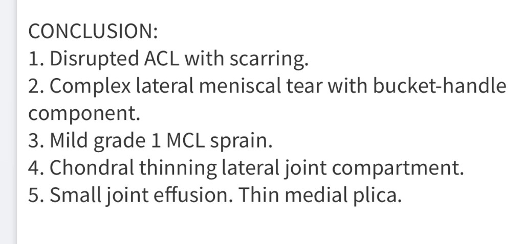 Of course since this is me and my injury, of course it would be the worst possible meniscus injury. The surgeon was hoping to be able to repair it, however my meniscus was shredded and unable to repaired. He salvaged what he was able to and removed what was not repairable.