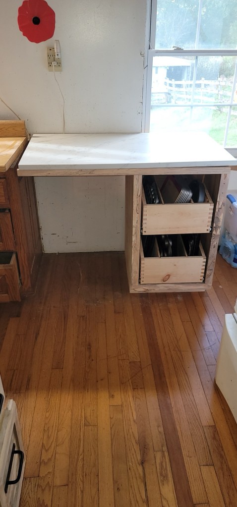 As you can see by the photos, this is why I am so conflicted. There is zero chance, I want to paint over that gorgeous wood. Can you see that beautiful wood grain!! So now I want to keep the cabinets natural. The problem with that is my original intention was to have a “butcher block” counter top. If we did that it would be way to much “wood” color and I feel it would drown out the beauty of the hand made cabinets. So I had to decide what to do about the counter tops.