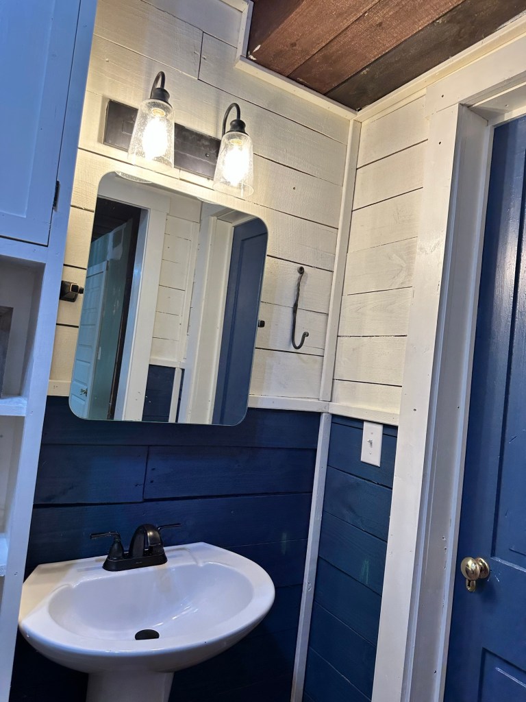 We also had the opportunity to do some work in the bathroom. Chad talked me into not shiplap the bathroom and go with Board and Batten instead. We finally we able to finish the vanity sink. My Dad did an amazing job of custom building the bottom and getting all the plumbing hooked up!