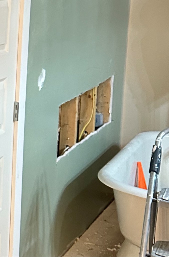 So, I really wanted a tiled niche in wall next to my beautiful cast iron tub. I love to take a long hot bath and want a place for soap shampoo and somewhere to set a drink. I figured no biggie with Dad and Chad it’ll be easy peasy.