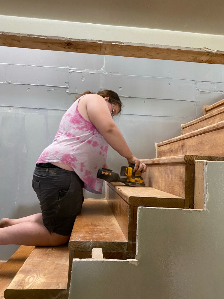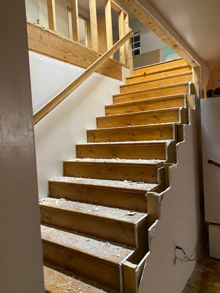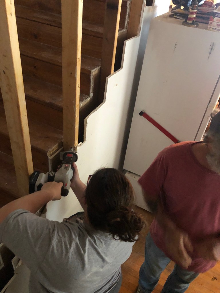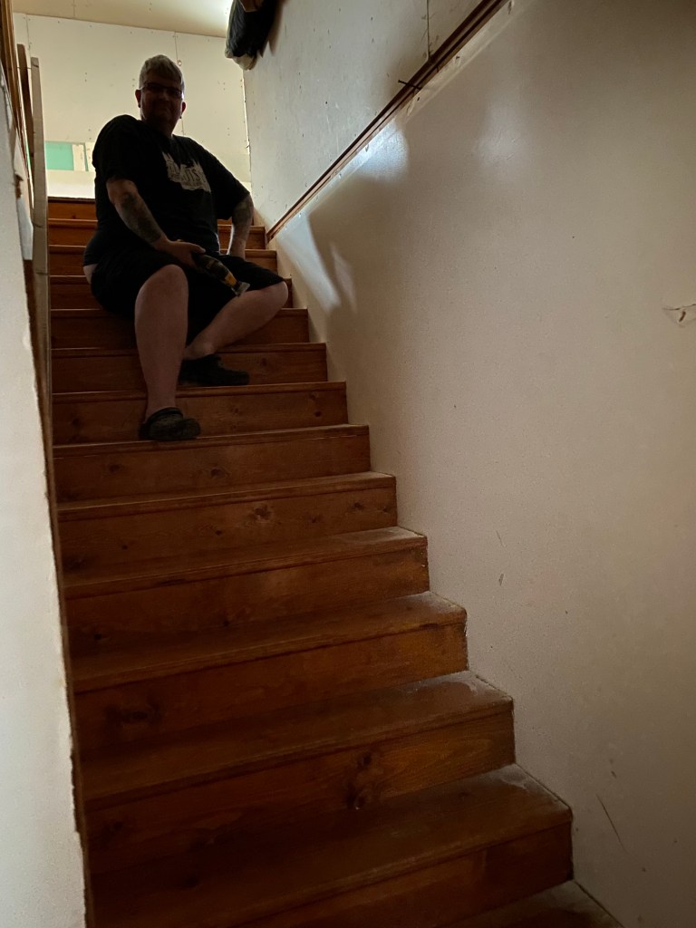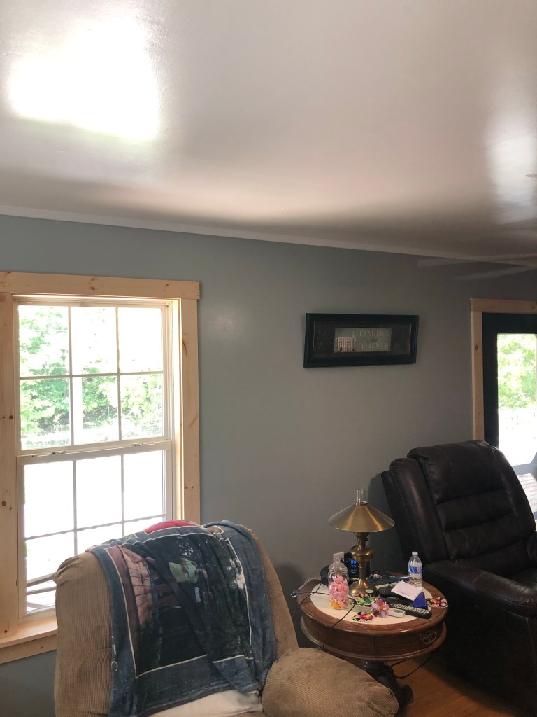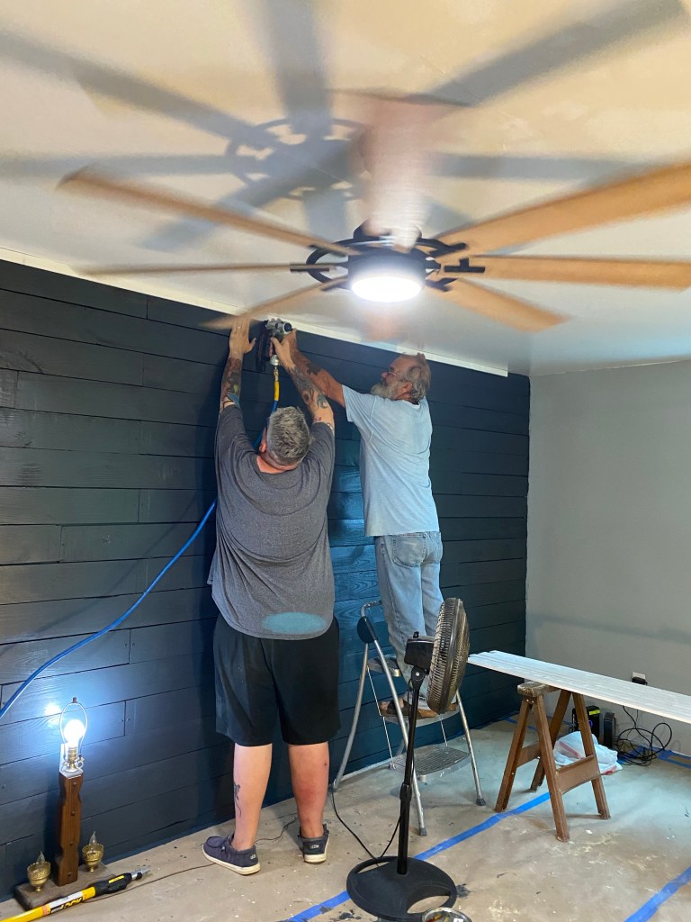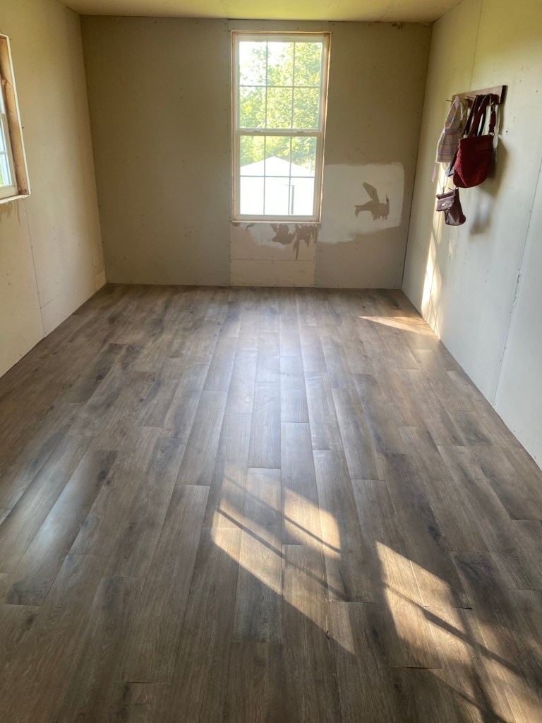 So now we are on to some of the more exciting and fun. We have made several trips back and forth from Texas to Kentucky. The last 4 1/2 days we spent on beautification projects. The living room we put up shiplap accent wall. I painted it chimney smoke grey. All around Kentucky you see black tobacco barns. So I think it is quit fitting to the area. Painted the rest of the living room and trimmed out the walls, door and windows. Chad installed a windmill ceiling fan (more parts than an IKEA project). I just love the ceiling fan, Chad was probably using some inappropriate language most of the install process. Normally the fan at Home Depot is over $800. We found it at a store in Wichita Falls for less than $50 🤯. Shiplapped the stairwell. Installed shiplap on several of the walls in various locations. And installed flooring in the upstairs library and one of the bedrooms.